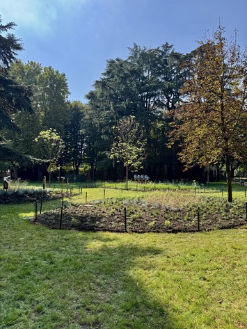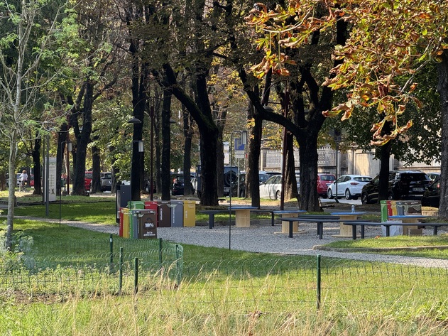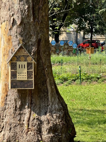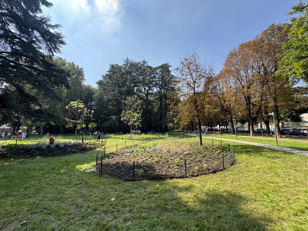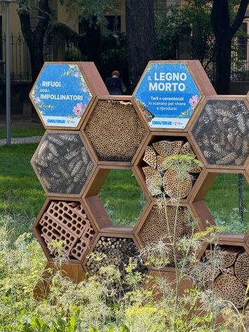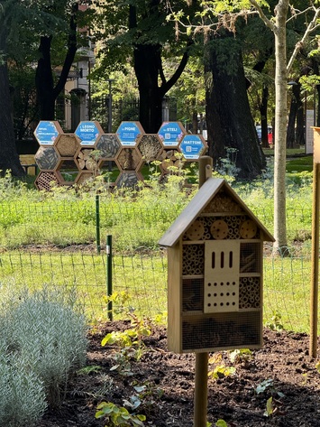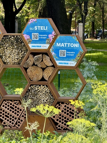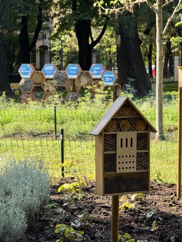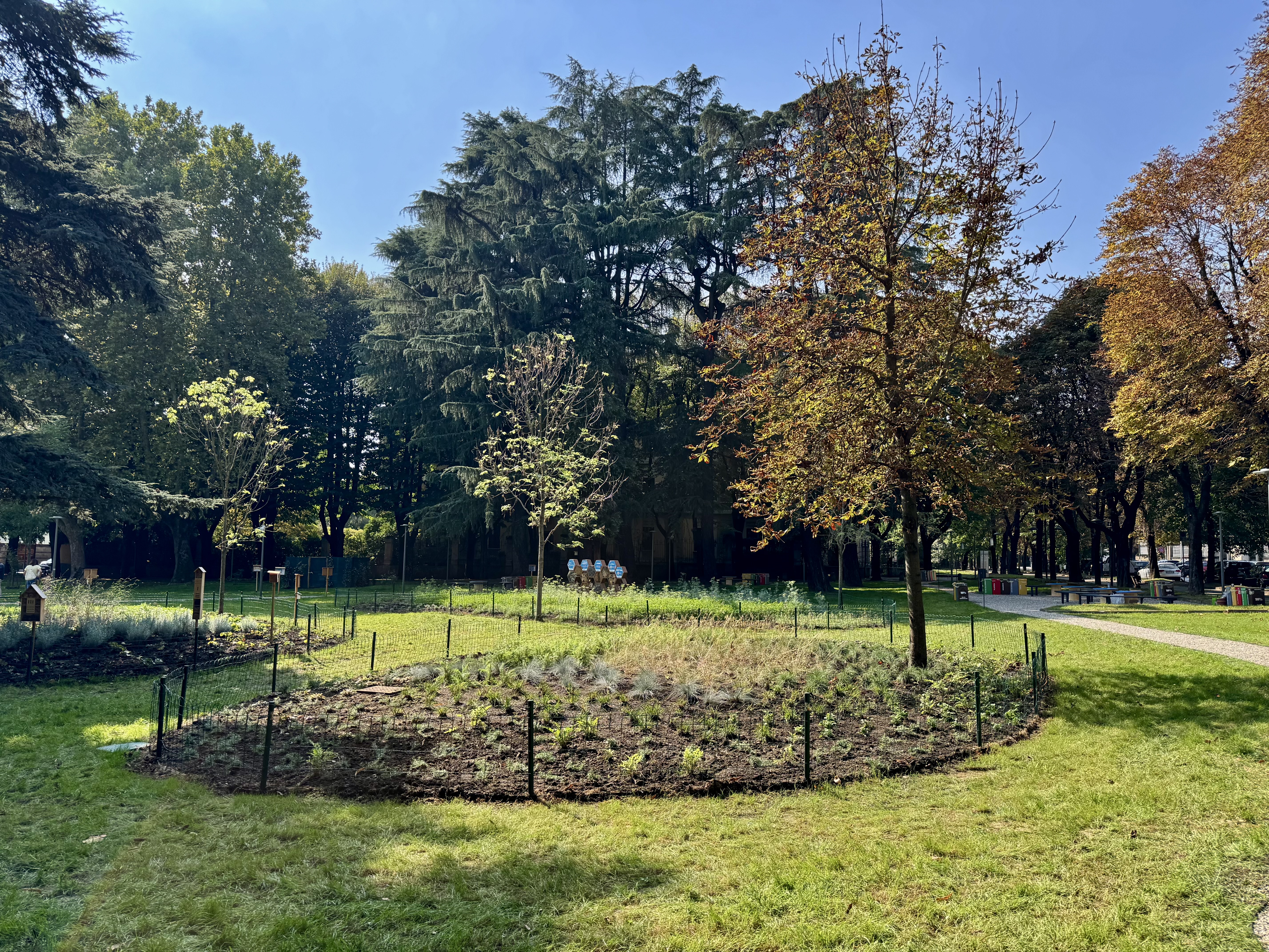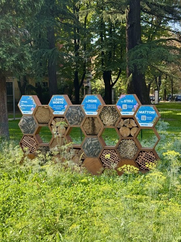 La rigenerazione ambientale di 5 mila mq di parco vuole essere un omaggio alla natura e alla tecnologia. Abbiamo creato aiuole fiorite con numerose specie di piante autoctone, aiuole verdi nettarifere, piante arbustive e inserito molti rifugi che ospiteranno gli insetti impollinatori.